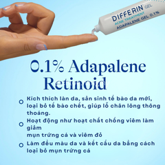 Thành phần chính của gel có chứa 0,1% Adapalene (hay tên gọi khác là differin), là 1 dạng Retinoid (Vitamin A) đã được chứng minh là có hoạt tính kháng viêm, chữa mụn hiệu quả, giúp kiểm soát dầu và giữ cho lỗ chân lông không bị tắt nghẽn, làn da được phục hồi lại như ban đầu.