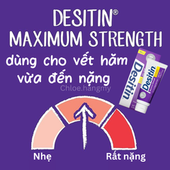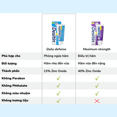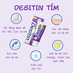 Kem hăm Desitin vỏ màu tím (Desitin Maximum Strength): Sản phẩm chứa 40% ZnO hỗ trợ chuyên sâu và làm dịu cảm giác khó chịu do hăm tã, tạo ra một môi trường tối ưu để da lành lại, đồng thời cung cấp hàng rào bảo vệ da khỏi các tác nhân gây kích ứng.
